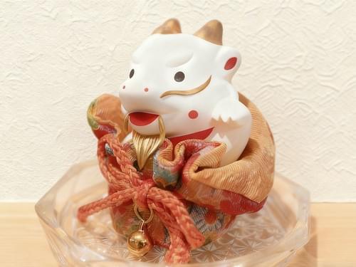 這隻狛犬擺件整體為白色,眼睛、嘴巴、臉頰處點綴著黑、紅等色彩,面部還有金色線條裝飾,顯得精緻可愛。它被包裹在色彩豐富、帶有傳統花紋的織物袋中,織物袋口用紅色繩結系緊,還掛著一枚金色鈴鐺,增添了幾分靈動俏皮。無論是擺放在家中作為裝飾,還是作為禮物送給他人,都兼具美觀性與美好寓意~🥰